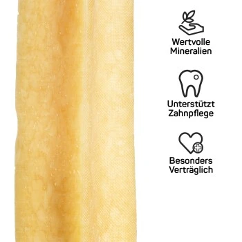 Der Fettgehalt der Yaky-Kaukäsestangen liegt bei unter 2%. Somit sind diese besonders bekömmlich und auch für Welpen und Senioren ideal geeignet. Durch ein spezielles Herstellungsverfahren sind die Yaky-Kaukäsestangen besonders hart und damit ein langanhaltendes Kauvergnügen. Die Kaustangen unterstützen zudem auf eine spaßige Art die Zahnreinigung und Maulhygiene und liefern gleichzeitg hochwertige Eiweißbausteine für den Körper und sättigen länger als herkömmliche Snacks. Die Kaustangen sind fast geruchslos.