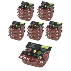 Intensiv im Geschmack und reich an wertvollen Nährstoffen – das zeichnet unser Wild-Menü frisch und fertig aus. Das magere Fleisch von Reh und Hirsch ist besonders leicht verdaulich und durch seinen hohen Anteil an Vitaminen, Spurenelementen und Mineralien eine gesunde Delikatesse für Deinen Hund. Das Frische-Menü enthält zusätzlich Erbsen, Kartoffeln und Öl. Kartoffeln sind glutenfrei und ein guter Energielieferant. Die vitaminreichen Erbsen sind auf besondere Weise gesundheitsförderlich: Die schwerer verdaulichen Anteile der Hülse werden im Dickdarm mikrobiell aufgeschlossen und fördern so die Entstehung einer gesunden Mikroflora im Dickdarm. Das stärkt das Immunsystem. Bei Hunden mit schlechter Darmflora können Erbsen vorübergehend zu Blähungen oder weicherem Stuhl führen. Langfristig profitieren aber auch sie in der Regel von dem positiven Effekt.